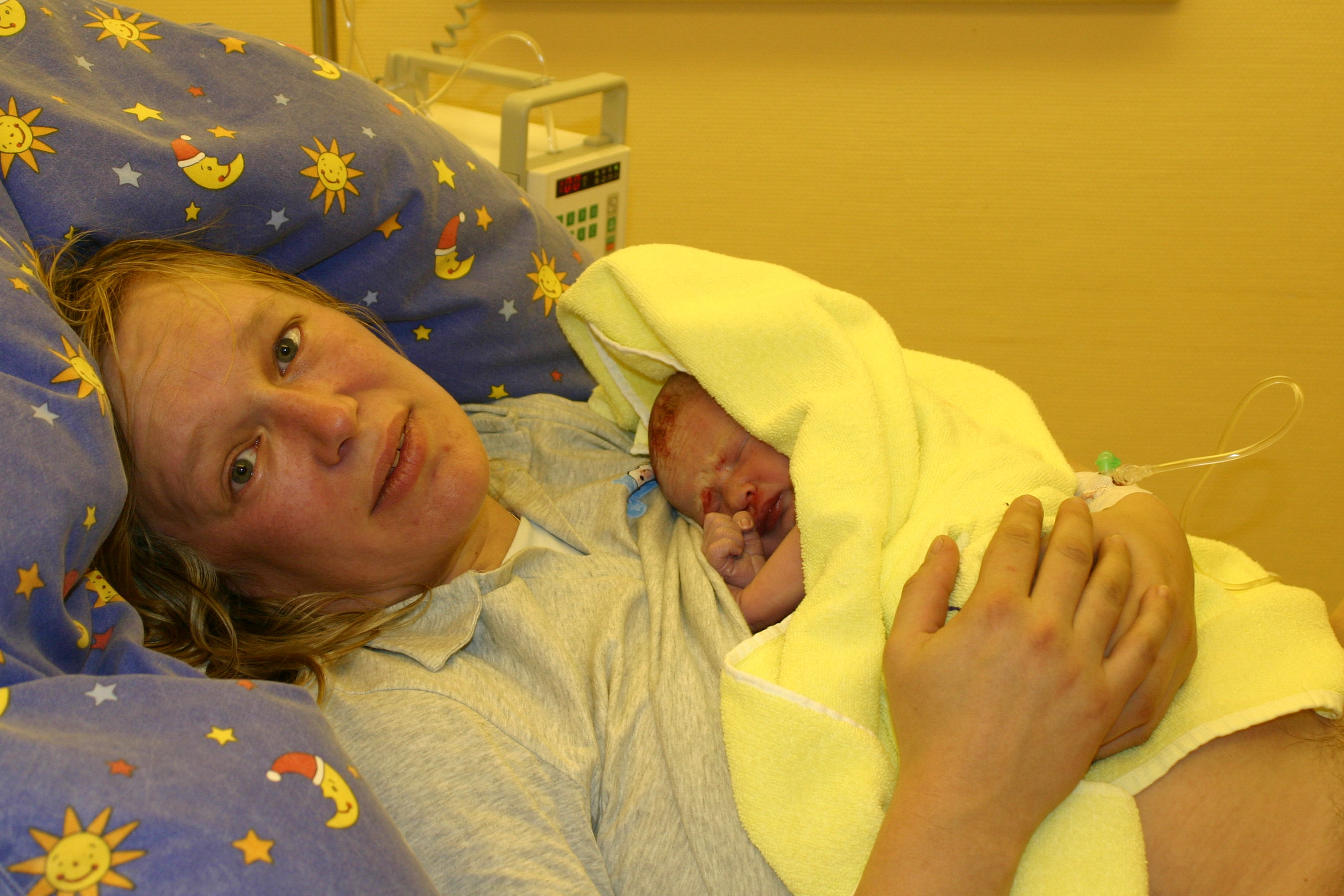 am 26.10. 2006 bin ich im Hanauer Stadtkrankenhaus um 06:05 Uhr zur Welt gekommen. Nachdem Mama gegen 21:00 Uhr die Blase geplatzt war, sind wir direkt ins Krankenhaus gefahren. Gegen 3:00 Uhr morgens kamen dann die Wehen im 4 Minuten Takt. Ab kurz nach 5 gingen dann die Presswehen los. Um kurz nach 6 habe ich dann das Licht der Welt erblickt. Hier seht Ihr mich und Mama direkt nach der Geburt: